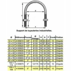 Support de tuyauteries industrielles fabriqué en acier zingué à partir de ronds laminés à chaud conformes à la norme NF A45 003 et avec des tolérances sur le diamètre conformes à la norme NF A45 075. Les étriers sont livrés avec deux écrous conformes à la norme NF E27 411.