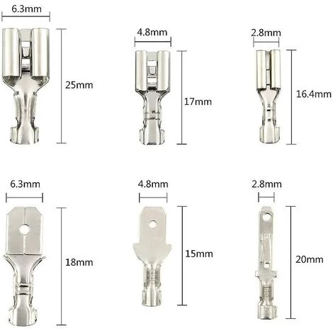 Spécifications : 6,3 mm de type : épaisseur : 0,4 mm pelle pelle (mâle), 0,8 mm (femelle), compatible Wire : 0,75–2,5 mm (AWG 18–14) 4,8 mm de type : épaisseur : 0,35 mm pelle pelle (mâle), 0,5 mm (femelle), compatible Wire : 0,75–2,5 mm2 (AWG 18–14) 2,8 mm de type : épaisseur : 0,25 mm pelle pelle (mâle), 0,5 mm (femelle), compatible Wire : 0,5–1,5 mm2 (AWG 22–16)