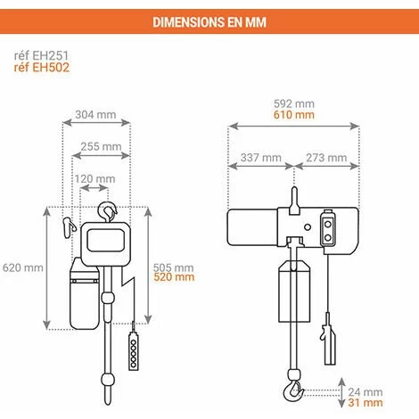 – Dimensions chaine : Ø5 x 15mm (ref EH251), Ø6,3 x 19mm (ref EH502) et Ø8 x 24mm (ref EH1001 et ref EH2002)