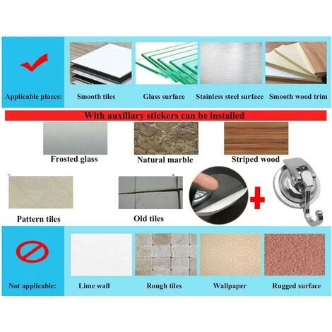 Pas d’outils, pas de perçage, pas de vis, pas de trous –-Placez simplement ces crochets à ventouse sur le carrelage mural, et appuyez pour fixer.La ventouse ne s’accroche que sur des surfaces non poreuses, lisses tels que le verre, les carreaux de céramique, les surfaces en acier inoxydable poli et ainsi de suite, facilement ajustable et réutilisable si nécessaire dans différentes positions.