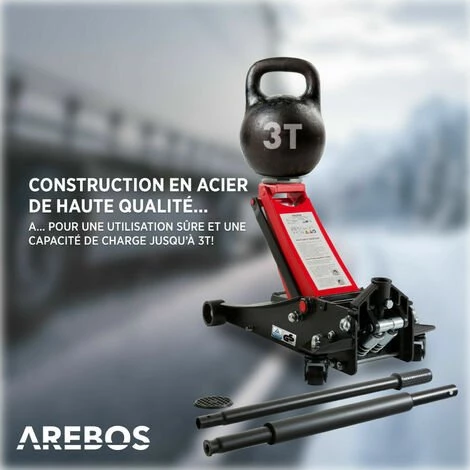 [Un compagnon fiable dans votre garage] Avec une capacité de charge allant jusqu’à 3 tonnes, ce cric hydraulique AREBOS est un petit outil très puissant pour une utilisation intensive et polyvalente. Il impressionne avec une hauteur de levage de 85 à 500 mm et une structure robuste.
