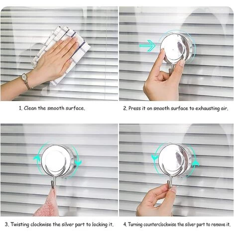 AMOVIBLE ET RÉUTILISABLE: Aucune trace, aucun rĂ©sidu collant, aucun dommage de surface après retrait. La seule chose que vous devez faire est de faire tourner les crochets d’aspiration vers la gauche pour Ă©vacuer l’air avec, de laver la ventouse Ă l’eau froide et de la rĂ©utiliser après sĂ©chage.