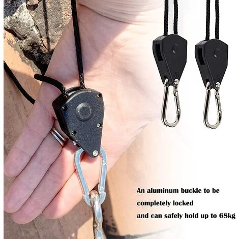 Matériau: La coque est en polypropylène, une corde en nylon soigneusement tressé avec une roue dentée en alliage de zinc robuste qui peut être ajustée de manière flexible et une boucle en aluminium pour être complètement verrouillée et peut supporter en toute sécurité jusqu’à 68 kg.