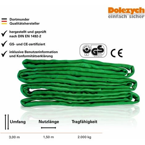 La boucle ronde proposée ici est équipée d’une seule couche et a une capacité de charge de 2000 kg. La capacité de charge est directement reconnaissable par une empreinte correspondante sur le tuyau, ainsi que sur la couleur codée. Le tuyau vert utilisé correspond toujours à une capacité de charge normativement prédéterminée de 2000 kg. L’élingue ronde est de 1,50 m de long. Conformément aux spécifications de la norme EN 1492-2, nos boucles rondes ont été établies depuis des années comme remplacement léger pour les produits de levage en acier tels que les chaînes et les cordes