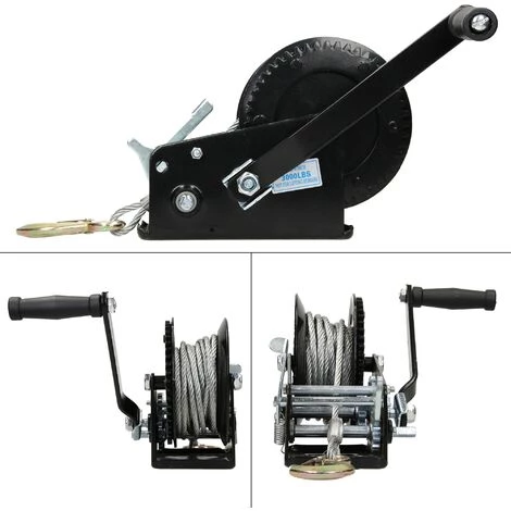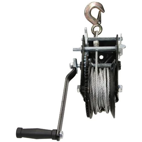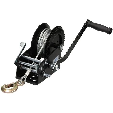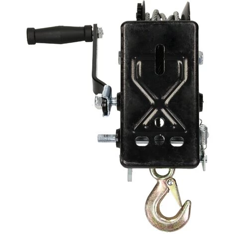 Le treuil à câble manuel d’ECD Germany est équipé d’un câble métallique sans torsion de 10 mètres de long, d’un crochet de charge de sécurité et d’un volet de sécurité. L’accessoire grue est équipé d’un treuil à câble pratique. Le treuil manuel à câble convient pour un poids allant jusqu’à 1500 kg.