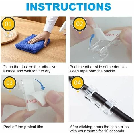【Remarque avant utilisation】 Assurez-vous que la surface de montage est propre. Aucune saleté, poussière, graisse et cire. Veuillez ne pas insérer le câble immédiatement après que le clip de câble est collé sur la surface d’utilisation; le tampon adhésif double face atteindra l’adhérence la plus forte après 24 heures.