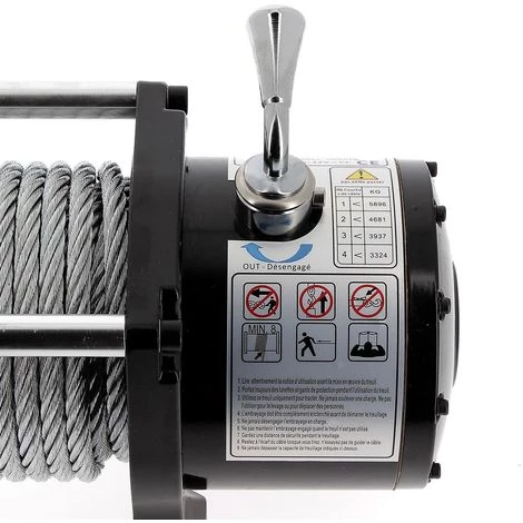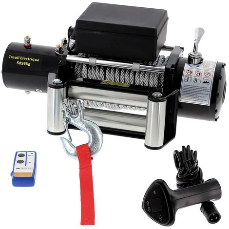 Treuil électrique 12 V robuste, idéal pour tirer une charge en ligne de 5896 kg maximum. Équipé d’une télécommande sans fil et d’une télécommande filaire, ce treuil dispose d’un long câble en acier ultra-résistant d’une longueur de 26 mètres. Il est recommandé de choisir un treuil dont la capacité de traction est supérieure de 50 % par rapport au poids théorique à tirer. Exemple : pour un bateau de 600 kg, utiliser un treuil de capacité 900 kg minimum. Pourquoi ? Parce que la capacité du treuil est toujours donnée pour un treuillage avec le câble en position parfaitement horizontale et pour une charge roulante (une voiture par exemple).