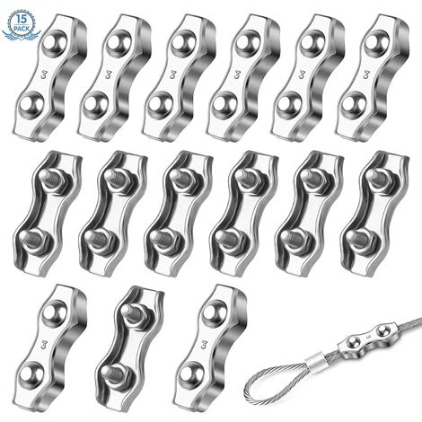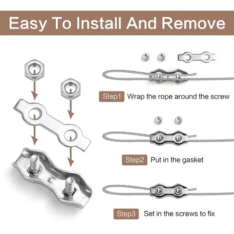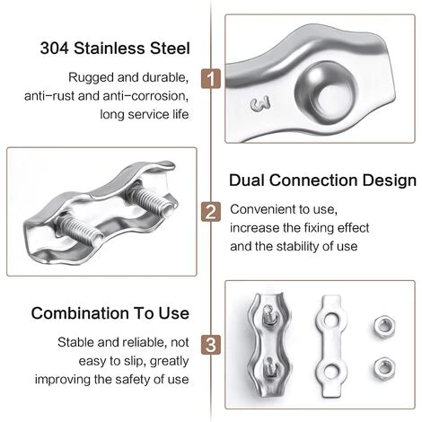 【Facile à utiliser】 Notre pince duplex en acier inoxydable est facile à monter. Vous pouvez mettre le câble métallique entre la douille et la rondelle, puis le fixer avec les écrous et les boulons, et tout est prêt. Vous n’avez pas besoin de trop d’outils pour l’installation ou le démontage.