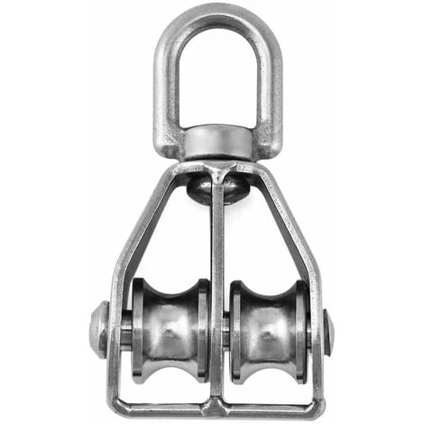 Type : poulie double M15, adaptĂ©e aux cordes jusqu’Ă 6 mm ; taille : M15 ; diamètre du patin : 15 mm ; largeur de la roue : 6 mm ; largeur de l’anneau rotatif : 11 mm ; longueur totale : 58 mm ; charge maximale : 35 kg; 360° rotation