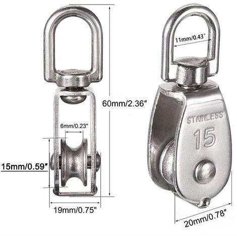Petite taille & grande capacité:Taille: M15; Diamètre de la roue: 15mm / 0,59 ″; Largeur de roue: 6mm / 0,23 ″; Largeur de la bague rotative: 11mm / 0,43 ″; Longueur totale: 60 mm / 2,36 ″; Charge maximale: 35kg / 77lbs. Quel rouleau simple mais puissant.