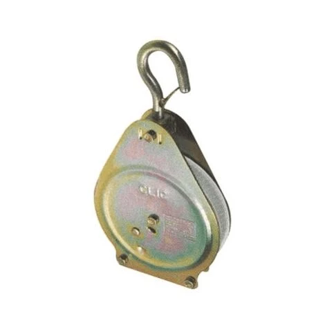 Poulie CLIC en acier bichromatĂ© avec gorge trapĂ©zoĂŻdale en polyamide crantĂ© Ă©quipĂ©e d’un cliquet anti-retour qui bloque le rĂ©a lorsque l’on cesse de tirer sur la corde. Le cliquet se dĂ©bloque lors d’une nouvelle traction. Ce systĂšme ne bloque pas complĂštement la corde qui doit toujours ĂȘtre maintenue, mais soulage fortement l’opĂ©rateur. Poulie de puits en fonte d’acier.