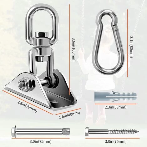 - Crochet de plafond pour balançoire : Contient 1pc* crochet pivotant de balançoire, 2pcs*vis d’expansion, 2pcs* vis, 1pcs* mousquetons, 2* fiche en plastique, Les crochets de hamac à rotation de 360° pour le kit de plafond peuvent charger jusqu’à 450kg avec une grande capacité de charge, très grand pour suspendre la chaise de hamac, la balançoire, le punching-ball, et la sangle de yoga à la relaxation intérieure et extérieure