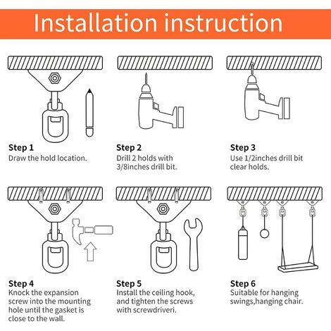 - Facile à installer : Avec ce kit de chaise de swing robuste, vous pouvez facilement l’installer sur un plafond en béton et une poutre en bois. Livré avec 2 tire-fonds hexagonaux qui conviennent à une application en béton et 2 vis qui conviennent à une application en bois. Cet ensemble d’accessoires peut être utilisé pour les chaises suspendues, les balançoires, les hamacs, les voiles d’ombrage, les auvents. Une bonne aide pour les activités de camping en plein air