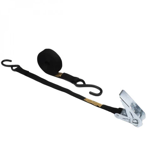 La sangle à cliquet et 2 crochets S est de couleur noire et mesure 5 m en longueur et 25 mm de largeur.