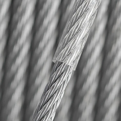 - Construction 7×7 – dureté : moyenne – élasticité : moyenne – âme du câble : aucune – toron : système de câble spiralé droit (RHRL)– revêtement PVC transparent