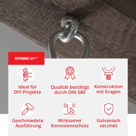 - Tr?s solide : fabriqué en acier C15 électro-galvanisé – résistant ? la corrosion et aux intempéries – certifié selon la norme DIN 580, testé avec succ?s et marqué CE – facilite le montage et le démontage des crochets, chaînes en acier, mousquetons, etc.