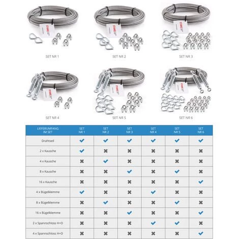 - Notre gamme comprend également d’autres sets de câbles métalliques de différents diam?tres et constructions, ainsi que les accessoires appropriés tels que des serre-câbles, des cosses, des tendeurs, des crochets et bien d’autres produits.