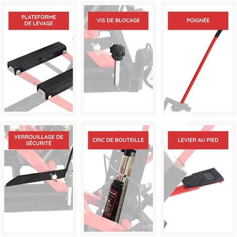 - Cric hydraulique Ă commande au pied avec trois positions de verrouillage pour faciliter l’utilisation.