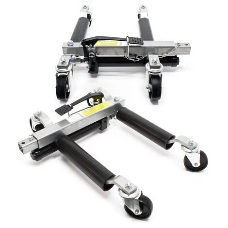 La paire de chariots de haute qualité va vous simplifier le travail dans les ateliers, les salles d’exposition de voiture, les musées, dans les foires commerciales, dans les courses de voiture etc. Les crics hydrauliques représentent une aide idéale pour soulever les voitures au niveau des roues et ce sans déployer beaucoup de force, ainsi que de ranger ou de déplacer le véhicule dans plusieurs positions même dans des espaces confinés. Le chariot se glisse tout simplement sous le pneu du côté latéral de la voiture. Grâce à une pédale intégrée, vous pouvez soulever le véhicule au niveau que vous désirez jusqu’à ce que la roue flotte librement. Pour ce faire, le cric va être contracté de manière hydraulique, jusqu’à ce que la roue en question perde l’adhérence au sol. Convient à une largeur de pneus de 30 cm environ.