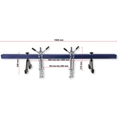 L’aide pratique pour les travaux sur l’embrayage, la transmission, le moteur ou la boîte à vitesse. Grâce à des tiges ajustables, à des pieds support pivotables et inclinables et des chaînes robustes, la barre traverse support moteur se pose sans problèmes et est adaptée même en cas d’inclinaison extrême des ailes.